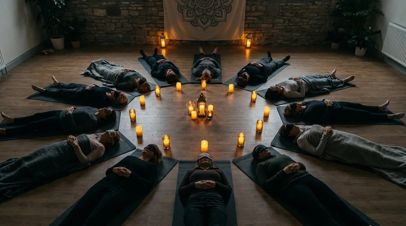 Lie down in a safe, guided environment. Eye masks on. The outside world fades. Your only job is to be here.